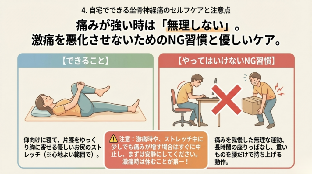 自宅でのセルフケアは、坐骨神経痛の緩和に有効ですが、誤った方法や無理な実践はかえって症状を悪化させる可能性があります。以下の点に注意しながら、安全に行いましょう。