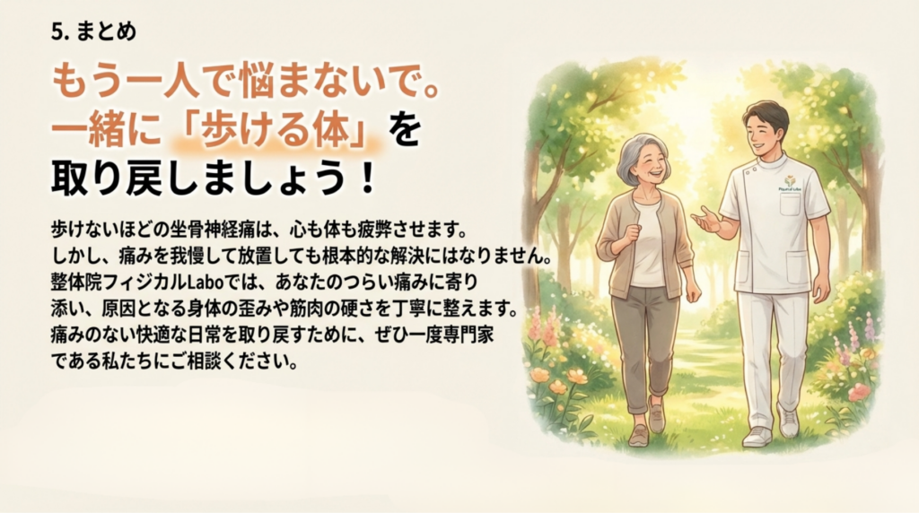 整体が坐骨神経痛で歩けないほどの痛みでお悩みの方に提供できる主なメリットを以下にまとめました。