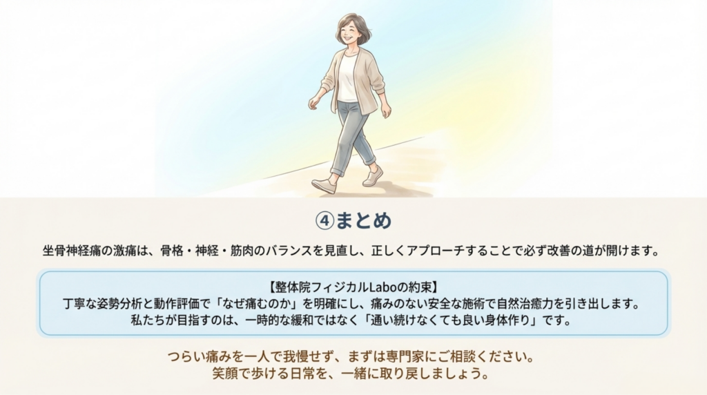 「立っていられない」ほどの激痛を抱えている場合、まずはご自身の身体の状態を正確に理解し、どのようなアプローチが最適であるかを専門家と相談することが大切です。整体は、その選択肢の一つとして、身体のバランスを整え、坐骨神経痛の症状を見直すための重要な役割を担っています。