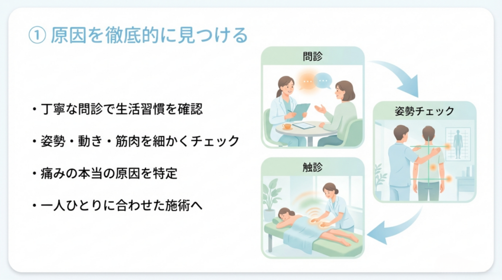坐骨神経痛の改善への第一歩は、痛みの真の原因を正確に把握することから始まります。整体院では、まず時間をかけた丁寧な問診を行います。いつから、どのような状況で、どこに、どのような種類の痛みやしびれがあるのか、日常生活での姿勢や動作の癖、過去の病歴など、詳細な情報を丁寧に聞き取ります。