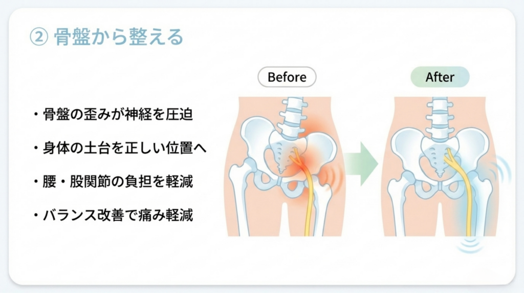 骨盤が整うことで、身体の土台が安定し、背骨や股関節への負担が軽減されます。これにより、坐骨神経を圧迫していた要因が取り除かれ、痛みやしびれの緩和につながります。また、骨盤のバランスが整うことで、全身の血流やリンパの流れも改善され、自然治癒力が高まる効果も期待できます。