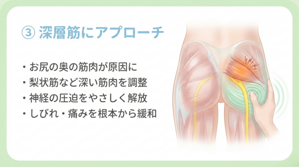 整体では、このような深層部の筋肉に対して、専門的な手技を用いてアプローチします。具体的には、以下のような方法で頑固な坐骨神経痛の緩和を目指します。