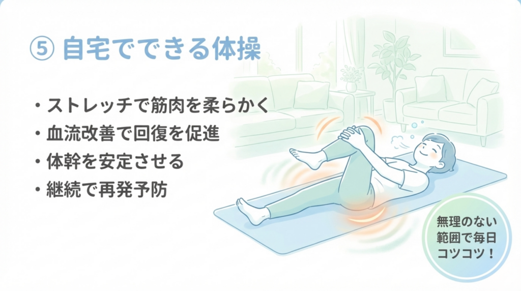 整体での施術効果を維持し、ご自身の力で坐骨神経痛の改善を促進するためには、ご自宅で継続できる体操やストレッチが非常に有効です。整体院では、お一人おひとりの体の状態や痛みの程度に合わせて、安全かつ効果的な体操を丁寧に指導いたします。