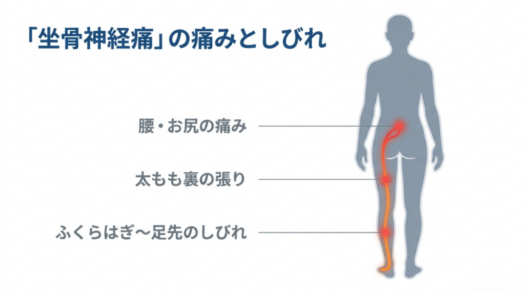 坐骨神経痛は、病気の名前ではなく、坐骨神経が何らかの理由で圧迫されたり、刺激を受けたりすることで生じる痛みやしびれなどの症状の総称を指します。お尻から太ももの裏、ふくらはぎ、そして足先にかけて、電気が走るような痛みやしびれが現れることが特徴です。多くの場合、体の片側に症状が出ることが一般的です。