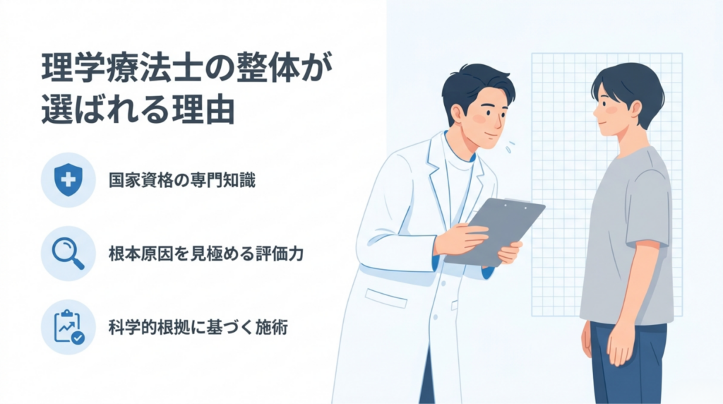 お客様の身体に直接触れる整体治療だからこそ、国家資格を持つ理学療法士による施術は、何よりも大きな安心感につながります。専門家としての知識と技術に基づき、お客様の身体を丁寧に評価し、適切な方法でサポートいたします。