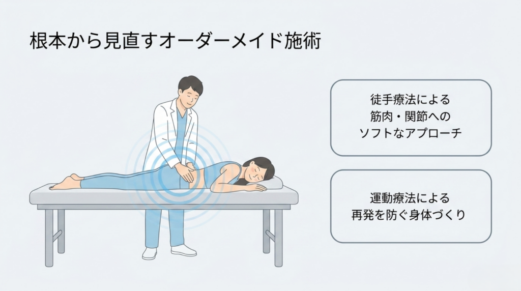 | 再発予防のための体づくり | 運動療法やセルフケア指導を通じて、筋力強化、柔軟性向上、正しい体の使い方を習得し、症状の再発を防ぎます。 |