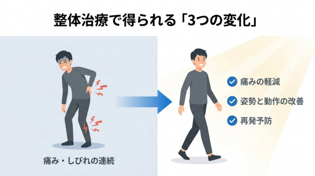 坐骨神経痛の整体治療は、単に現在の痛みやしびれを和らげるだけでなく、身体の根本的なバランスを見直し、将来にわたる健康的な生活をサポートすることを目指します。理学療法士による専門的なアプローチは、一時的な対処療法にとどまらず、長期的な視点での改善を追求するものです。ここでは、整体治療によって具体的にどのような効果が期待できるのかを詳しくご紹介します。