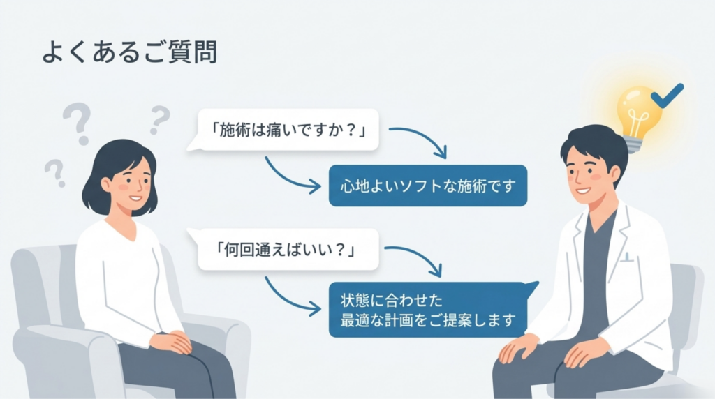 施術中も、お客様とのコミュニケーションを大切にし、痛みや不快感があればすぐに伝えていただけるようお声がけいたします。お客様の身体の反応を見ながら、常に施術内容や圧の強さを調整いたしますので、ご心配は不要です。多くの方が、施術後に身体が軽くなった、リラックスできたといった感覚を実感されています。