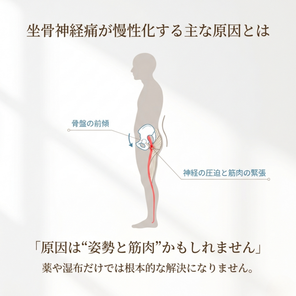 坐骨神経痛の痛みは、一時的なものとして現れることもあれば、長期間にわたって生活の質を大きく低下させる慢性的な症状へと移行することもあります。なぜ、一部の方の坐骨神経痛は慢性化してしまうのでしょうか。ここでは、その主な原因と、痛みが長引くメカニズムについて詳しく見ていきましょう。