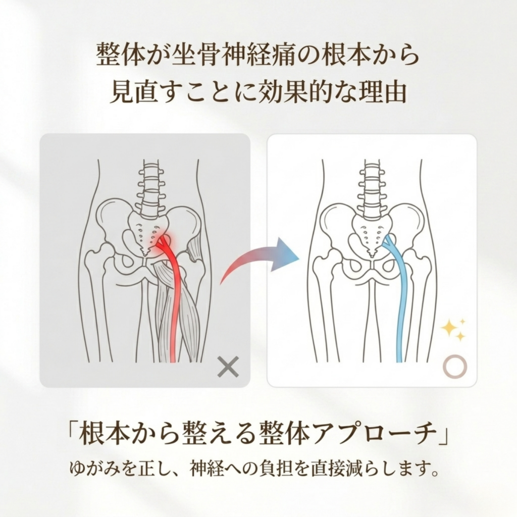 慢性的な坐骨神経痛の痛みは、その場しのぎの対処ではなかなか見直すことが難しいものです。一時的な痛みの緩和だけではなく、痛みが繰り返される根本的な原因に目を向け、身体のバランスを整えることが重要です。整体は、まさにこの根本原因にアプローチすることで、坐骨神経痛の症状を和らげ、再発しにくい身体づくりをサポートします。
